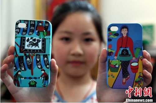 一套四款金山農(nóng)民畫限量版 iphone外殼,選用TPU材料制作,利用國外先進(jìn)的水印技術(shù),將四位知名金山農(nóng)民畫師的獲獎(jiǎng)作品《新娘提水》、《打工妹》、《曬籃印布》和《大公雞》“印”在蘋果手機(jī)殼上。充滿鄉(xiāng)土氣息的傳統(tǒng)民間繪畫,與備受青睞的時(shí)尚科技產(chǎn)品,巧妙結(jié)合在一只小小的手機(jī)殼上,顯示民間藝術(shù)與時(shí)尚潮流的“互動(dòng)”。(來源:中新網(wǎng))