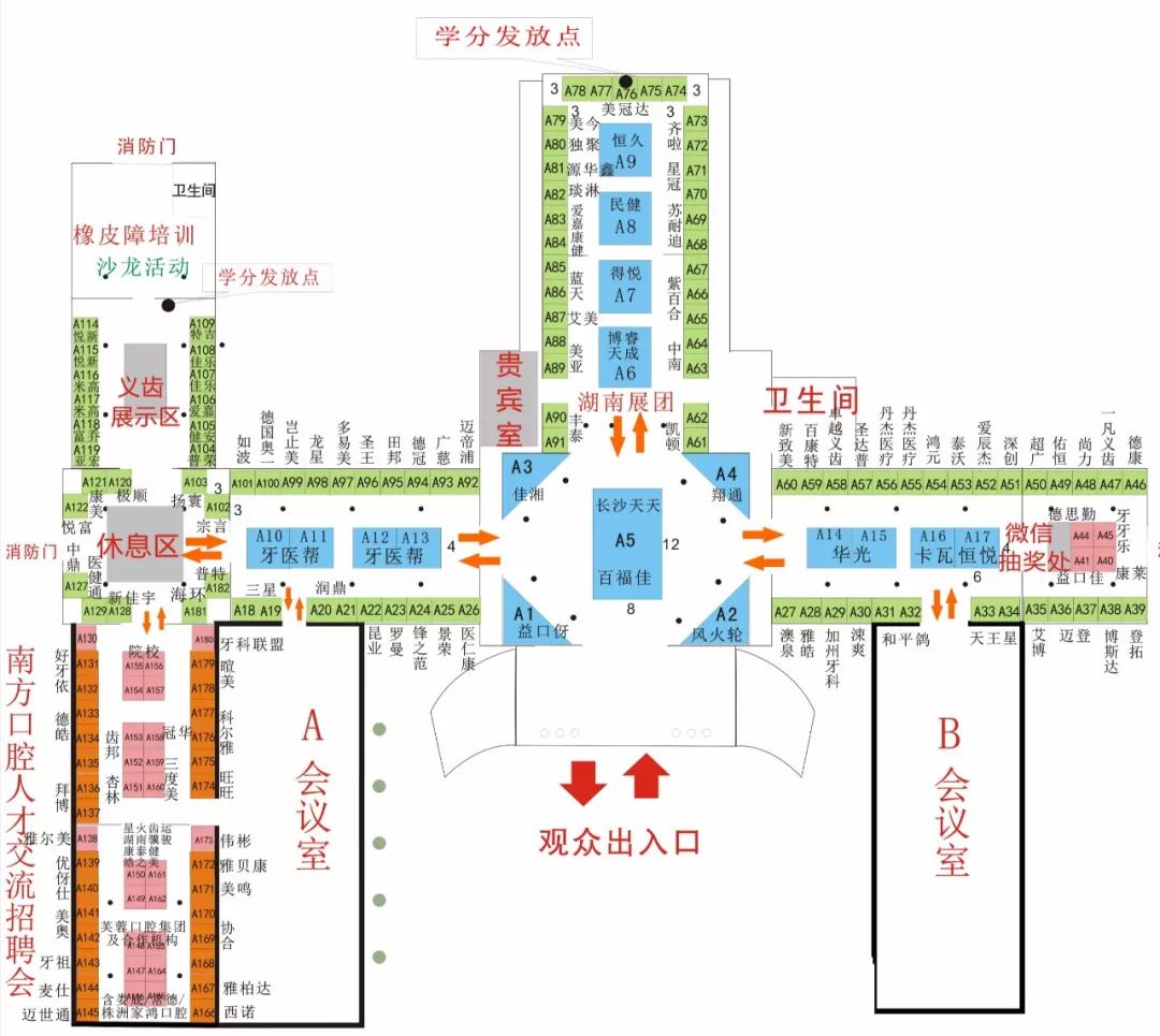 A會議室、B會議室、湖南展團(tuán)區(qū)、人才招聘區(qū)、義齒展示區(qū)、微信抽獎區(qū)、沙龍活動區(qū)、休息區(qū)、學(xué)分發(fā)放點