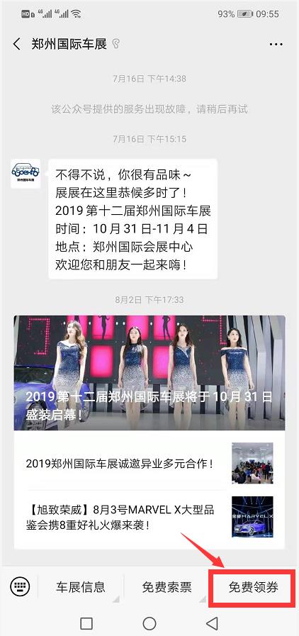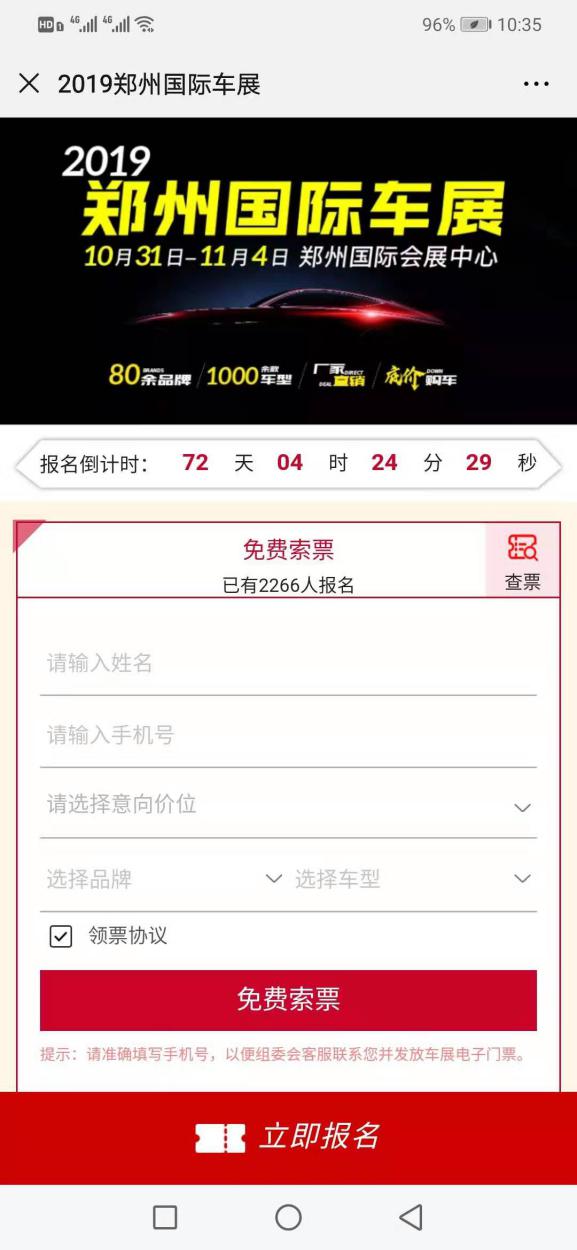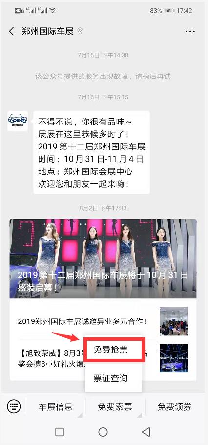 1、關(guān)注“鄭州國際車展”官方微信,選擇菜單欄“免費(fèi)索票”,點(diǎn)擊“免費(fèi)搶票”;