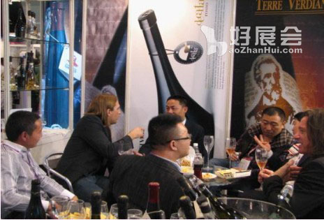 圖:第七屆廣州國際名酒展某展位,海外展商與中國進口酒經(jīng)銷商親密洽談。