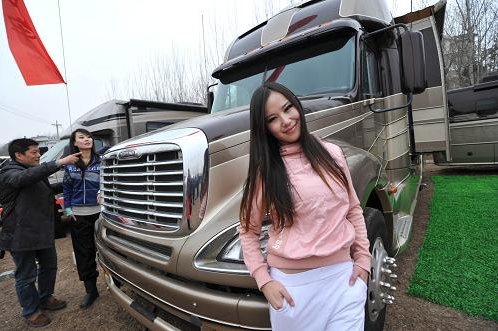3月22日,一名車模站在第四屆北京國際房車露營展一款大型房車前。當(dāng)日,為期4天的2012第四屆北京國際房車露營展覽會在北京市房山區(qū)北京房車博覽中心開幕。近200輛房車,近千種各類型房車零配件等與公眾見面。
