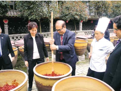 外國友人在體驗(yàn)制作郫縣豆瓣的工藝
