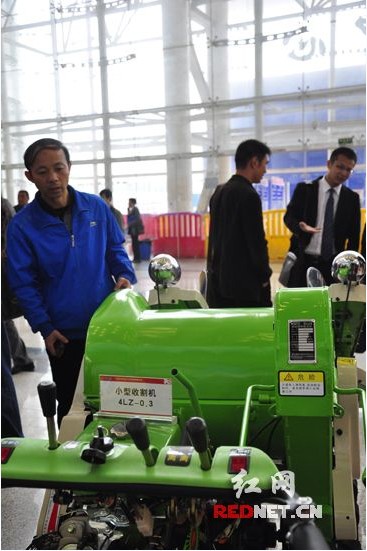 2012全國(guó)農(nóng)業(yè)機(jī)械展覽會(huì)在湖南國(guó)際會(huì)展中心舉行,一臺(tái)號(hào)稱(chēng)全球最小最輕的收割機(jī)吸引了參觀(guān)者的目光。