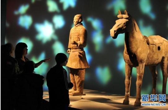 4月25日,觀眾在美國(guó)紐約參觀展出的中國(guó)秦朝兵馬俑。當(dāng)天,以兵馬俑為主題的“兵馬俑:中國(guó)始皇帝的衛(wèi)兵”主題展覽在紐約舉行預(yù)展,包括秦始皇兵馬俑在內(nèi)的數(shù)百件國(guó)家級(jí)文物展出。這是紐約首次舉行以兵馬俑為主題的展覽。展覽將于27日向公眾開放。(來(lái)源:新華網(wǎng))