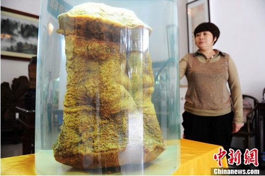5月2日,湖南長(zhǎng)沙烈士公園瀟湘奇石館內(nèi)一尊高76厘米、胸徑約106厘米、重52公斤的“太歲”吸引了市民的眼球。“太歲”的擁有者張淑君表示,這尊“太歲”是傳家之寶,需要千年才能長(zhǎng)那么大,一直養(yǎng)在家里的一口大缸中,論個(gè)頭來(lái)說(shuō)在全國(guó)都十分罕見(jiàn)。據(jù)悉,“太歲”又稱“肉靈芝”,十分稀有,是百藥中的上品。有典籍記載,“太歲”性平,苦,無(wú)毒,具有補(bǔ)脾潤(rùn)肺,補(bǔ)腎益肝等價(jià)值。(來(lái)源:中新網(wǎng))