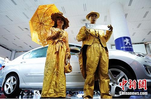 5月3日,以“樂享生活”為主題的2012湖南車展在湖南國(guó)際會(huì)展中心開幕。參展商們?yōu)槲M(fèi)者,各想奇招。在某品牌汽車展區(qū)前,兩位裝扮成活體雕塑的人手拿車牌進(jìn)行促銷,吸引了眾多消費(fèi)者的眼球。(來源:中新網(wǎng))