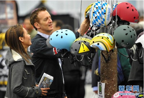 5月3日,參觀者在紐約自行車博覽會上選購自行車頭盔。當天,2012年紐約自行車博覽會開幕并免費向市民和游客開放。博覽會展示了功能多樣的自行車及配件,吸引大批市民觀看和體驗。(來源:新華網(wǎng))
