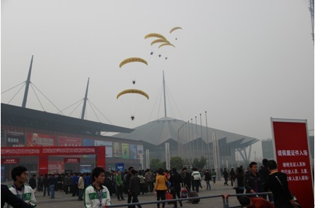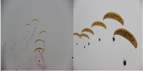 3架動(dòng)力傘在汽博中心上空宣傳