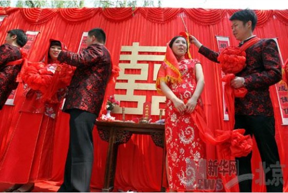 5月8日,一場按照北京民俗舉辦的中式集體婚禮在北海公園舉行,六對新人喜結(jié)良緣。此次婚禮揭開了2012西城時(shí)尚婚慶文化博覽會的“蓋頭”。作為2012北京西單國際時(shí)尚節(jié)系列主題活動之一,2012北京西城時(shí)尚婚慶文化博覽會于5月8日--13日在北海公園舉辦。(來源:新華網(wǎng))
