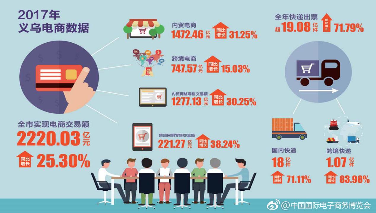 2017年,義烏市實現(xiàn)電商交易額2220.03億元,同比增長25.30%。其中,內(nèi)貿(mào)電商1472.46億元,同比增長31.25%;跨境電商747.57億元,同比增長15.03%。內(nèi)貿(mào)網(wǎng)絡零售交易額1277.13億元,同比增長30.25%;跨境網(wǎng)絡零售交易額221.27億元,同比增長38.24%。