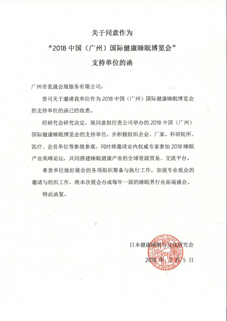 日本健康睡眠與文化研究會關(guān)于同意作為廣州睡博會支持單位的函