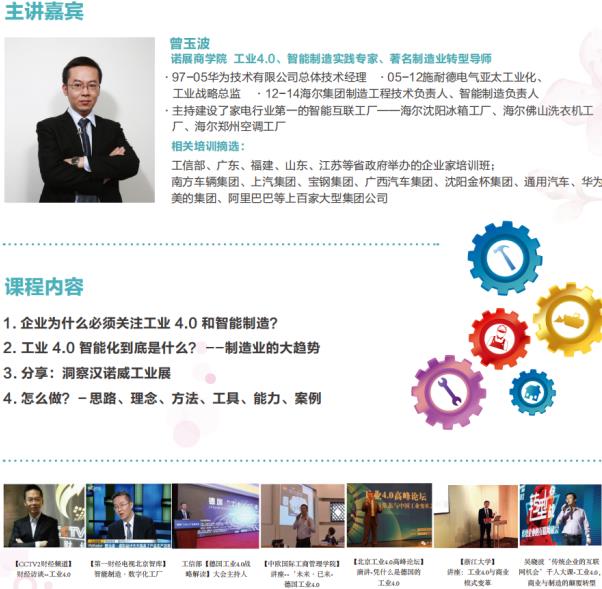 2018年金諾濟南機床展開展在即,配套推出《工業(yè)4.0與企業(yè)智能化轉(zhuǎn)型》培訓(xùn)課程,由榮登央視的智能制造實踐專家、著名制造業(yè)轉(zhuǎn)型導(dǎo)師曾玉波親臨現(xiàn)場,進(jìn)行授課與指導(dǎo)。