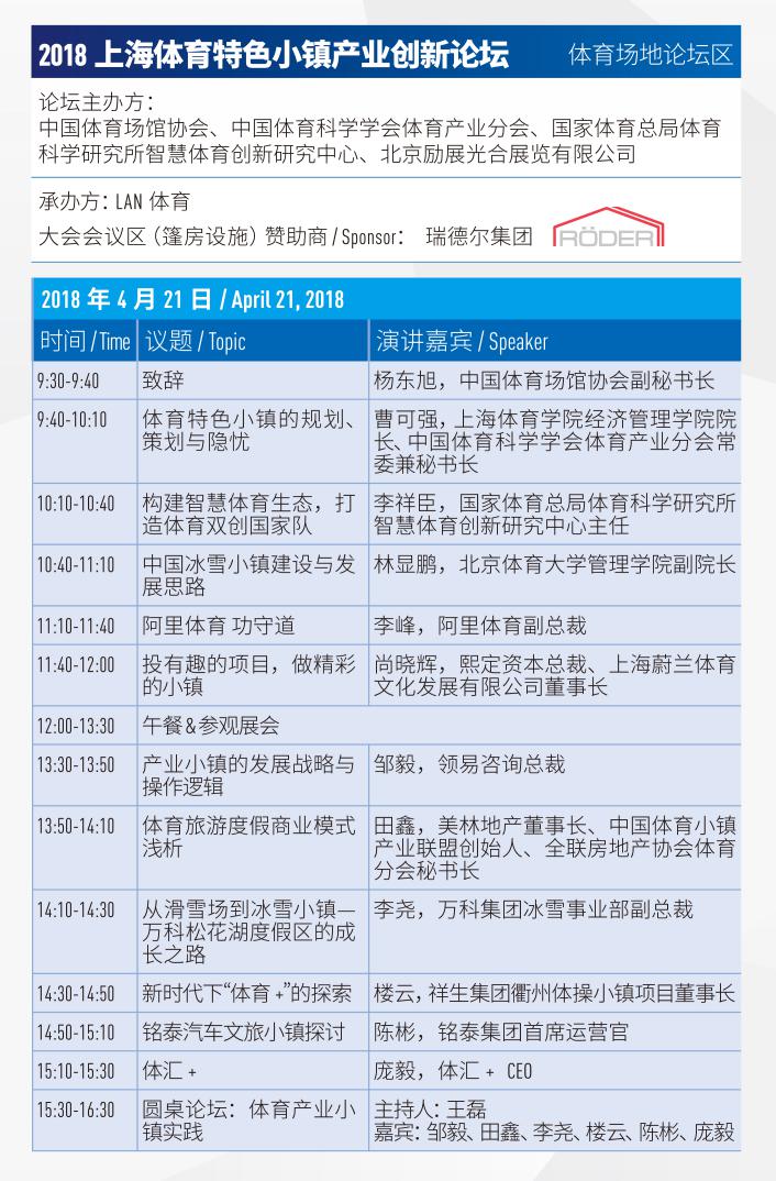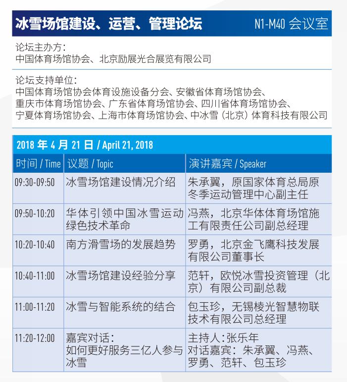 明天21日主題特色論壇“冰雪場館建設、運營、管理論壇”和“2018上海體育特色小鎮(zhèn)產(chǎn)業(yè)創(chuàng)新論壇”,也將分別于N1-M40會議室和館內(nèi)體育場地論壇區(qū)舉辦。