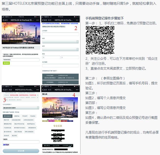HOTELEX Beijing 2018參展預(yù)登記正火熱開展,在此特別提醒請及時預(yù)登記。想了解更多展會信息,請微信搜索并關(guān)注公眾號“上海國際酒店及餐飲業(yè)博覽會“,了解相關(guān)信息。
