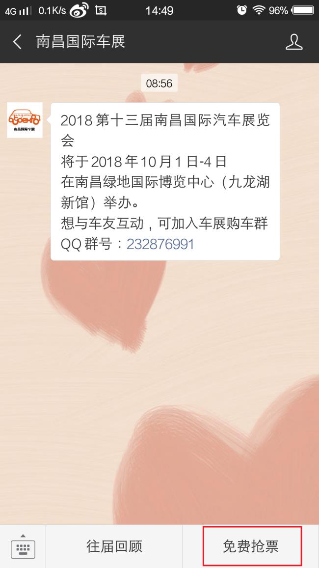 即日起到9月31日下午17點(diǎn)前你只要通過“南昌國際車展”官方微信公眾號(hào)就可以領(lǐng)取車展免費(fèi)門票。