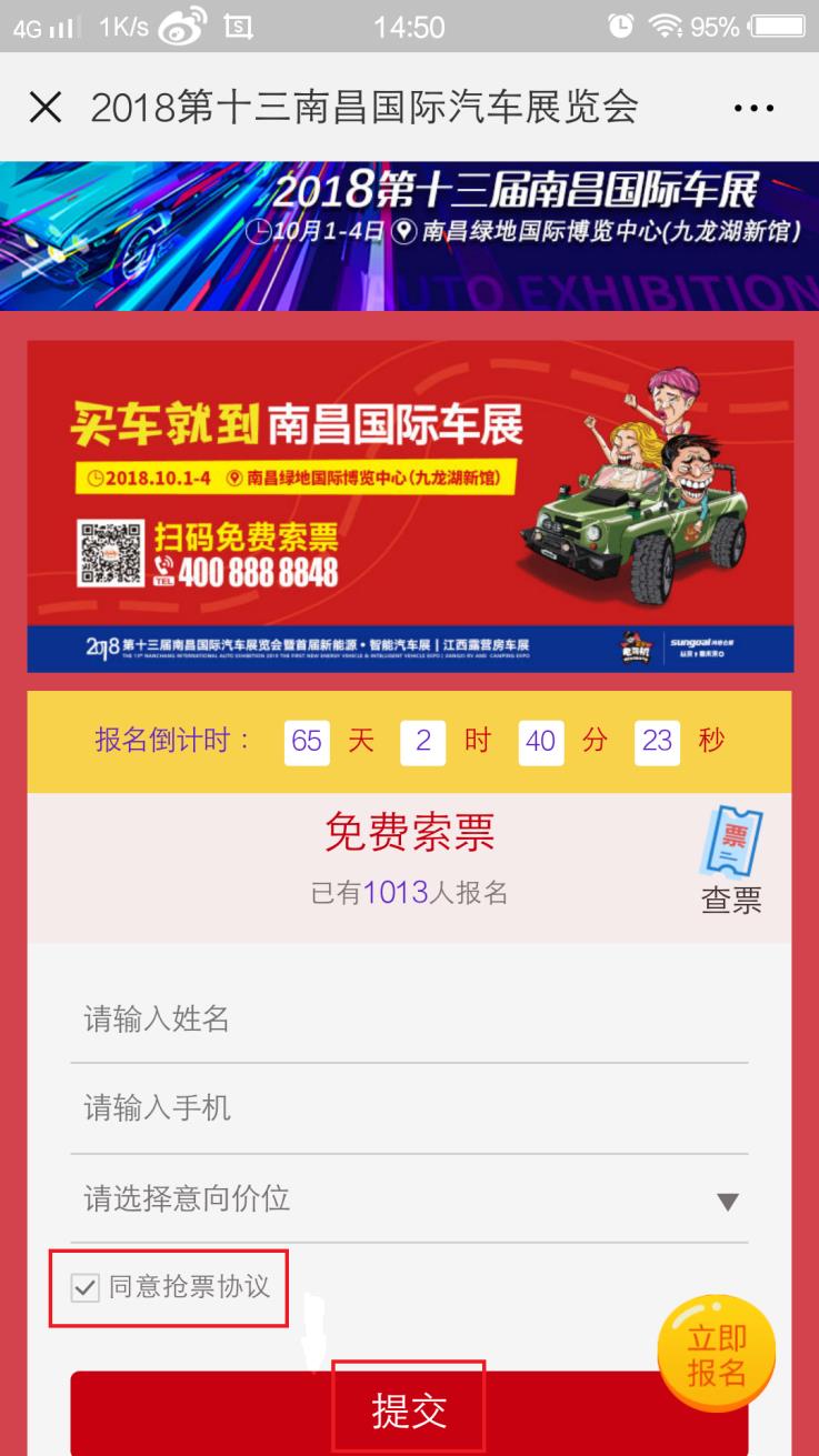 關(guān)注“南昌國際車展”微信號(hào),點(diǎn)擊下方【免費(fèi)搶票】進(jìn)入頁面提交信息即可。