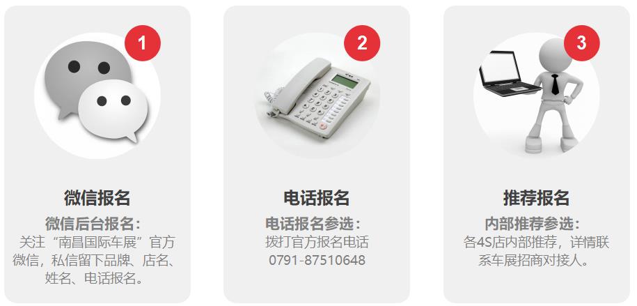 即日起至9月9日(截止時間9月9日下午17:00),各品牌汽車4S店的汽車銷售代表只需關(guān)注“南昌國際車展”官方微信,后臺發(fā)送報名信息或撥打電話0791—87510648進行報名,還可以由各大汽車品牌單位內(nèi)部評選推薦報名 。