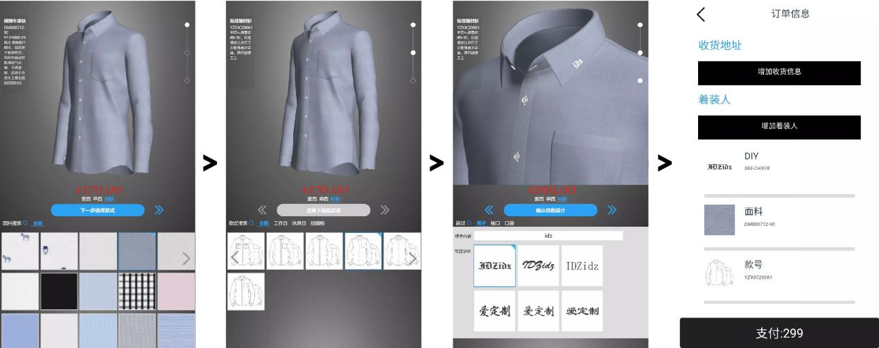 用戶定制一套服裝,只需要通過移動(dòng)端APP或線下觸摸大屏,做好“?挑選面料、?挑選款式、?選擇專屬刺繡等個(gè)性化細(xì)節(jié),3D渲染輕每一步的定制效果,輕松完成個(gè)性化服裝定制”三個(gè)步驟,然后提交訂單+人工智能AI遠(yuǎn)程量體,真正做到一人一版。