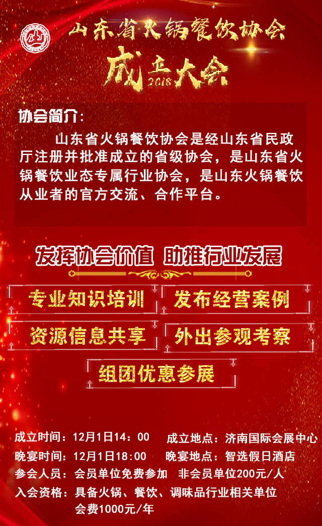 山東省火鍋餐飲協(xié)會是經(jīng)山東省民政廳注冊并批準成立的省級協(xié)會,是山東省火鍋餐飲業(yè)態(tài)專屬行業(yè)協(xié)會,是山東火鍋餐飲從業(yè)者的官方交流、合作平臺。協(xié)會貫徹落實政府“食安山東”品牌建設,為山東火鍋餐飲行業(yè)的上中下游企業(yè)搭橋引線,做好行業(yè)的規(guī)范和服務工作。給大家搭建一個信息交流、資源共享、互幫互助、抱團發(fā)展的平臺。