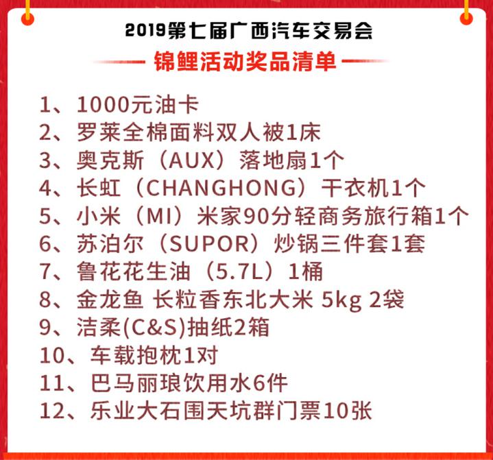 為了回饋廣大市民朋友對(duì)本屆廣西車交會(huì)的支持,車展組委會(huì)特別推出免費(fèi)觀展搶錦鯉大禮包活動(dòng),凡是在3月14日中午12:00前報(bào)名觀展的用戶,均可參與抽獎(jiǎng)。而在開展首日(3月15日12:00),車展最強(qiáng)錦鯉即將誕生,好玩、福利、優(yōu)惠看得見。到底誰能獨(dú)攬禮品清單中的12種好禮,讓我們拭目以待。