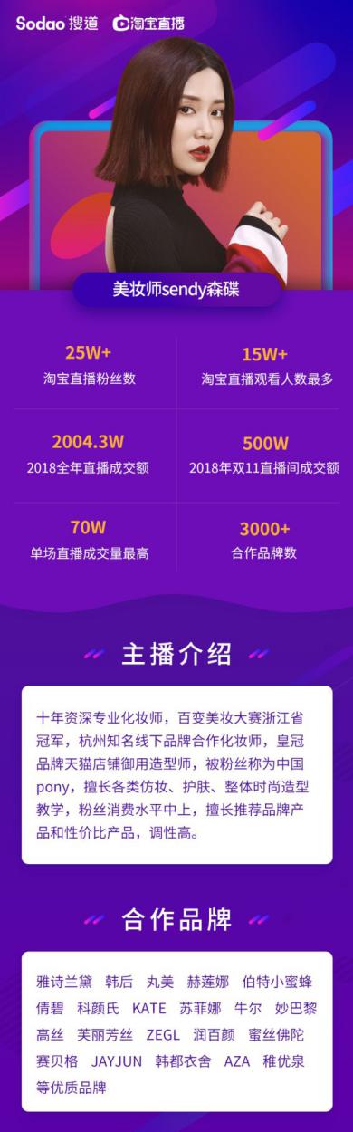 提及搜道,這是一家第一批入駐淘寶直播的機(jī)構(gòu),自直播上線來(lái),穩(wěn)居淘寶直播top機(jī)構(gòu)席位,旗下簽約主播達(dá)50余名,合作達(dá)人百余位,其中打造培養(yǎng)出首席百萬(wàn)級(jí)粉絲柔柔家柔柔、30W+粉絲、20W+粉絲主播近二十位,主播類目已涵蓋美妝、母嬰、美食、運(yùn)動(dòng)健身等不同范疇。 2018年旗下主播帶動(dòng)銷售超百萬(wàn)筆,總銷售額突破一億大關(guān);整體數(shù)據(jù)名列五百家淘寶直播機(jī)構(gòu)前十。