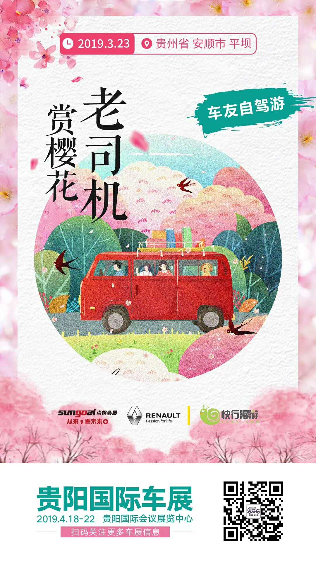 陽春三月,櫻花爛漫。2019年3月23日,2019貴陽國際車展與貴州十和田風(fēng)景雷諾聯(lián)合舉辦的“老司機(jī).賞櫻花”車友自駕游活動(dòng)圓滿舉行!本期參與活動(dòng)的雷諾車主正式成為“貴州365自駕車友會(huì)”首批會(huì)員,感謝所有車主和貴州黃果樹智慧旅游股份有限公司、平壩櫻花萬畝園景區(qū)和貴州風(fēng)景汽車銷售服務(wù)有限公司的大力支持。預(yù)祝4月18-22日所有2019貴陽國際車展車商大賣!