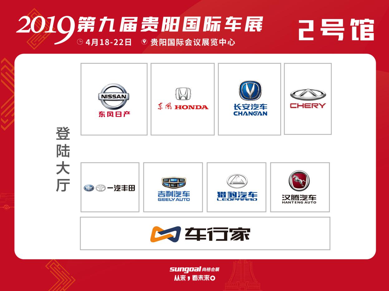 2號(hào)館(按順時(shí)針方向):東風(fēng)日產(chǎn)、東風(fēng)本田、長(zhǎng)安汽車、奇瑞、漢騰汽車、獵豹汽車、吉利汽車、一汽豐田