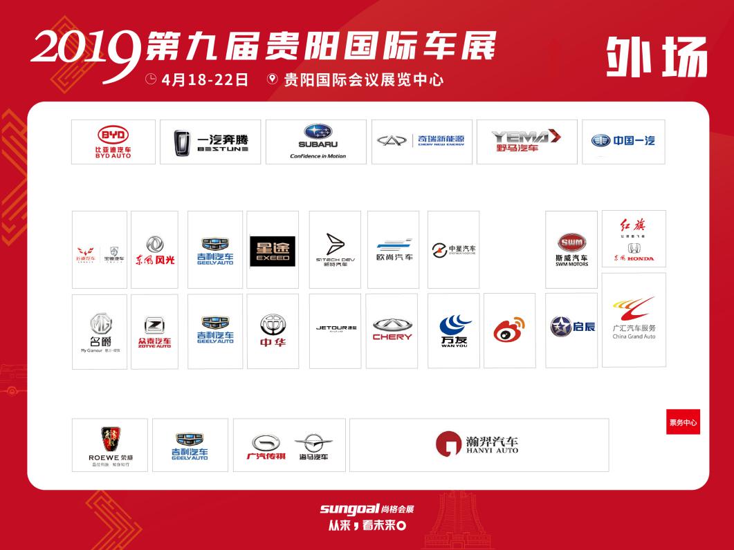 外 場(chǎng)(按順時(shí)針方向):比亞迪汽車、一汽奔騰、斯巴魯、奇瑞新能源、野馬汽車、中國(guó)一汽、紅旗、斯威汽車、中星汽車、歐尚汽車、新特汽車、星途、吉利汽車、東風(fēng)風(fēng)光、寶沃汽車、五菱汽車、MG、眾泰汽車、中華、捷途、奇瑞汽車、萬(wàn)友、新浪、東風(fēng)啟辰、廣匯汽車服務(wù)、瀚羿汽車、海馬汽車、廣汽傳祺、吉利汽車、榮威汽車