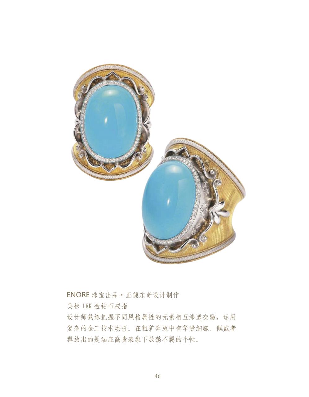設(shè)計(jì)師以粗獷有力的金屬線條和明亮溫暖的配石色彩,恰到好處的迎合了大師雕刻作品。整件作品完美演繹出雕刻作品與金工鑲嵌的和諧融洽。配以繁復(fù)華麗的鑲嵌工藝。獲得第十屆中國(guó)上海玉石雕刻“玉龍獎(jiǎng)”銀獎(jiǎng)。