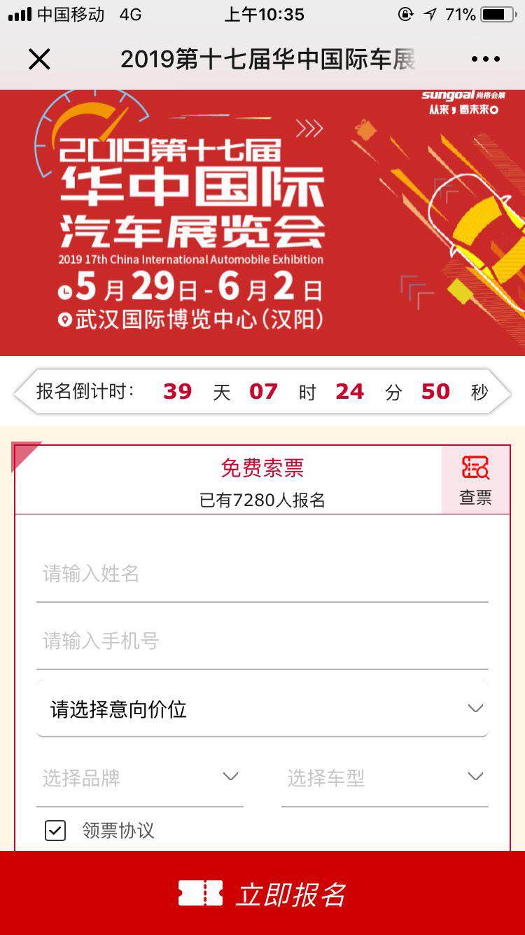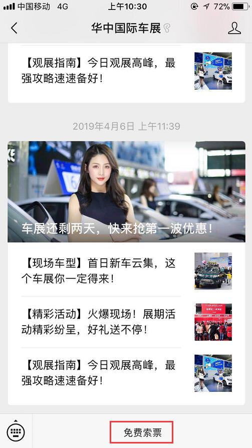 1、進入“華中國際車展”官方微信,點擊“免費索票”,填寫并提交報名信息,以便客服聯(lián)系您發(fā)送門票。