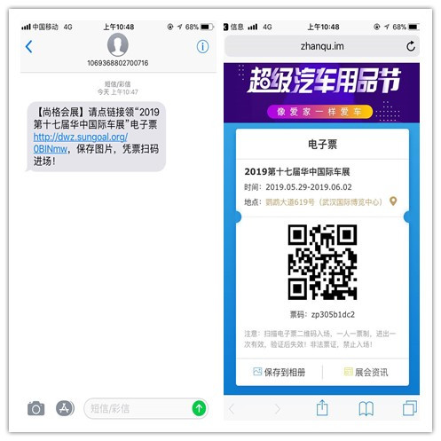 3、接下來,請注意接聽來自武漢市的客服電話(座機或手機號),客服將為您發(fā)送車展電子門票。電子門票為一條帶鏈接的短信,如下。點開鏈接,即是電子門票,可截圖,憑票入場。