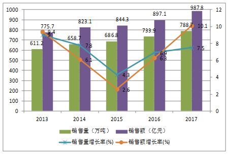 根據(jù)中國膠粘劑和膠粘帶工業(yè)協(xié)會的統(tǒng)計數(shù)據(jù),2013-2017年中國膠粘劑和密封劑行業(yè)一直保持著增長的勢頭。2017年膠粘劑與密封劑的銷售量、銷售額分別為788.7萬噸、987.8億元,分別增長7.5%和10.1%。這充分說明了2017年面對嚴(yán)峻形勢和艱難挑戰(zhàn),我國膠粘劑行業(yè)不斷提升質(zhì)量控制和技術(shù)管理水平,產(chǎn)業(yè)結(jié)構(gòu)調(diào)整穩(wěn)步推進,行業(yè) 發(fā)展的技術(shù)基礎(chǔ)進一步增強。
