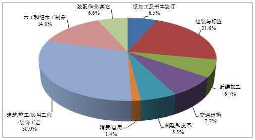 膠粘劑應(yīng)用市場增長最快的應(yīng)用領(lǐng)域是建筑/施工/民用工程/裝飾工藝,占總應(yīng)用市場的30%,而包裝與標(biāo)簽用膠占21.6%,木工和細木工制品用膠占14.0%,交通運輸用膠占7.7%。纖維加工、裝配作業(yè)、紙加工及書本裝訂、制鞋和皮革這四個領(lǐng)域,分別占5.5?6.7%之間。