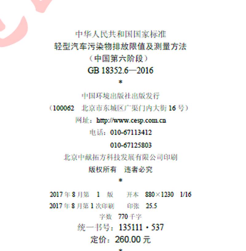 國(guó)六標(biāo)準(zhǔn)的全文,有400頁(yè)之巨,可在中華人民共和國(guó)生態(tài)環(huán)境部官網(wǎng)下載到電子版——如果你有興趣翻到最后一頁(yè),還會(huì)發(fā)現(xiàn)這套標(biāo)準(zhǔn)已有書刊號(hào)、且印刷出版,定價(jià)260元。