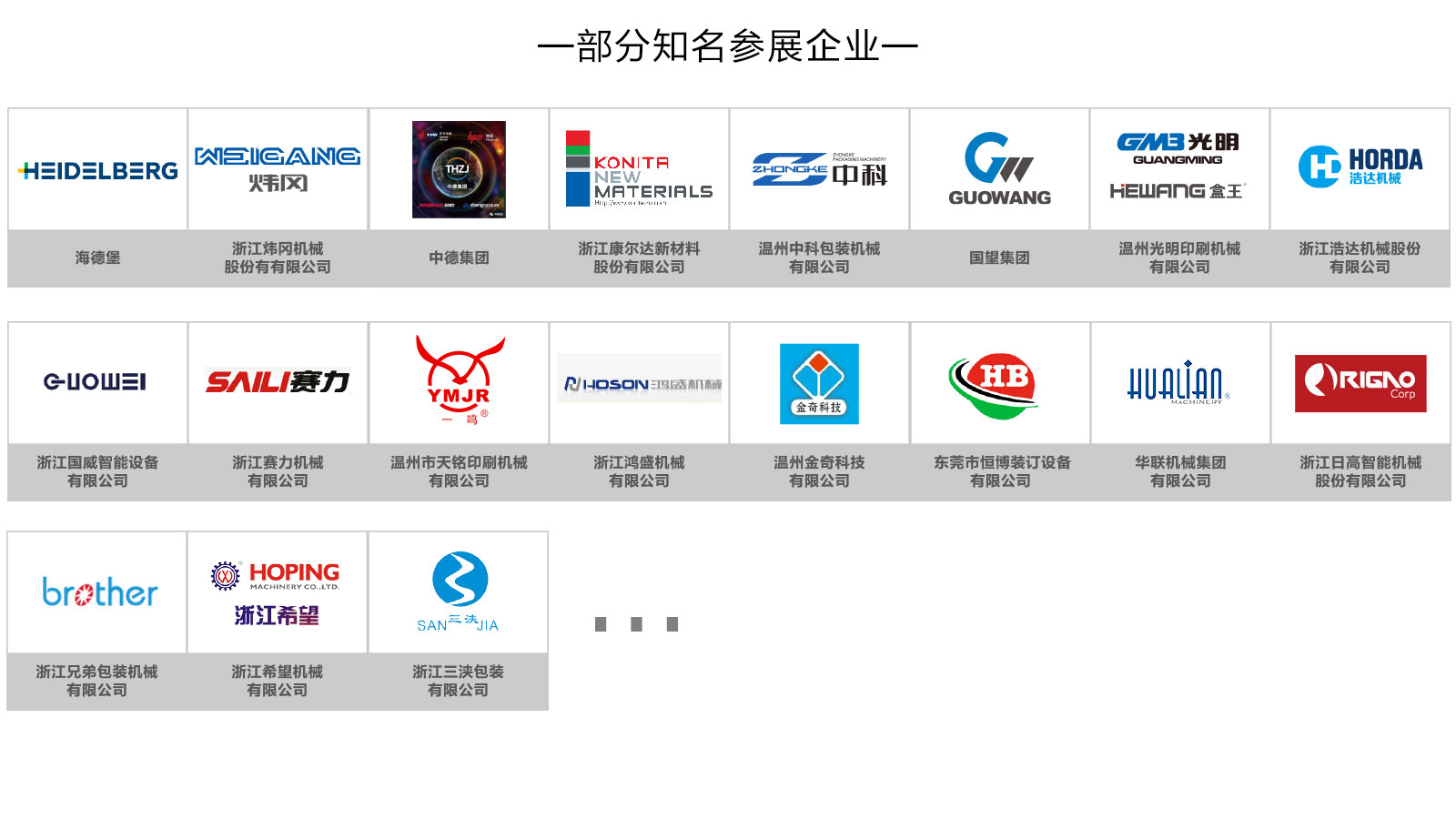 展會依托溫州——“中國印刷城”、“中國包裝機(jī)械城”、“中國印刷材料交易中心”、“中國印刷設(shè)備制造業(yè)第一區(qū)域品牌”、全球優(yōu)質(zhì)制造商聚集地產(chǎn)業(yè)高地優(yōu)勢和強(qiáng)勁的市場需求,吸引國內(nèi)外知名企業(yè)、品牌參展,展會展出產(chǎn)品涵蓋印刷、包裝、廣告標(biāo)識、數(shù)碼印花、圖文快印等品類。海德堡、煒岡、中德、康爾達(dá)、中科、國望、光明、浩達(dá)、國威、賽力、天銘等印刷行業(yè)龍頭企業(yè)悉數(shù)參與展會;“智能包裝產(chǎn)業(yè)技術(shù)聯(lián)盟”成員華聯(lián)、日高、希望以及兄弟、三浹等包裝設(shè)備知名企業(yè)將攜新品展出;此外,博印、金奇、明睿等數(shù)碼印花、圖文快印、廣告標(biāo)識企業(yè)也將共襄盛會。
