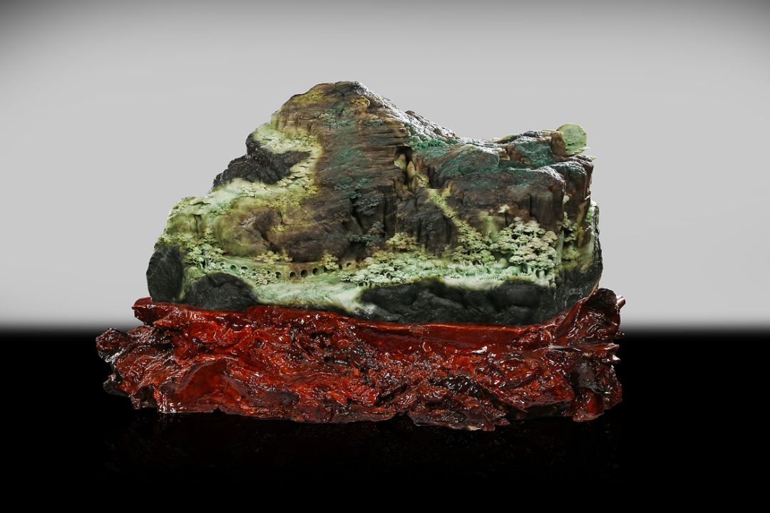 作品《巍巍太行》材質(zhì)為獨山玉,作品靈感源于自然山林。此原料為雜色獨山玉,綠、白、褐、青等顏色相互呈浸染狀或漸變過渡狀存在于同一塊體上,其塊度大,形狀似山峰。作者以此為基礎,用巧奪天工的高超技藝雕刻出太行山勝景。借用中國山水畫中散點透視,高遠、深遠、平遠的“三遠”表現(xiàn)手法,巧用顏色體現(xiàn)前后關系以及畫面立體感。近處的樹林、橋梁、牛群、流水;遠處的庭閣、房屋、小路、云彩,以淺色表現(xiàn),比例適當、線條流暢、細節(jié)處理到位傳神,能抓住觀者第一視角。以褐、棕色表現(xiàn)山脈,突顯山脈的陡峭層疊、莊重巍峨之感,太行山的大氣磅礴與山中生活意境之美完美呈現(xiàn)。