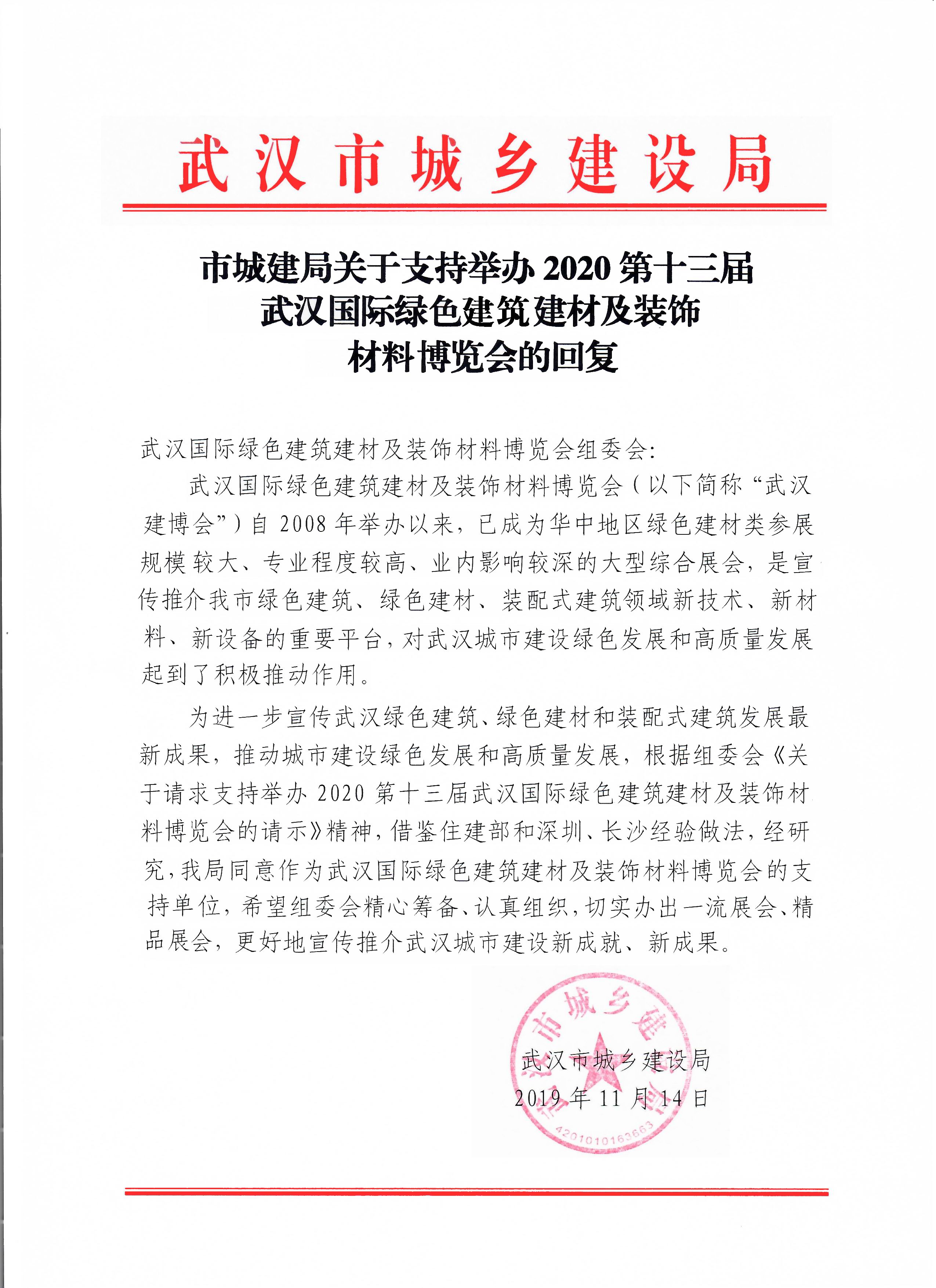 日前,武漢市城建局做出決定,全力支持2020第十三屆武漢國際綠色建筑建材及裝飾材料博覽會(簡稱:武漢建博會)做大做強(qiáng),并下文回復(fù),強(qiáng)調(diào)要切實(shí)辦出一流展會、精品展會,更好宣傳推介武漢城市建設(shè)新成就、新成果。