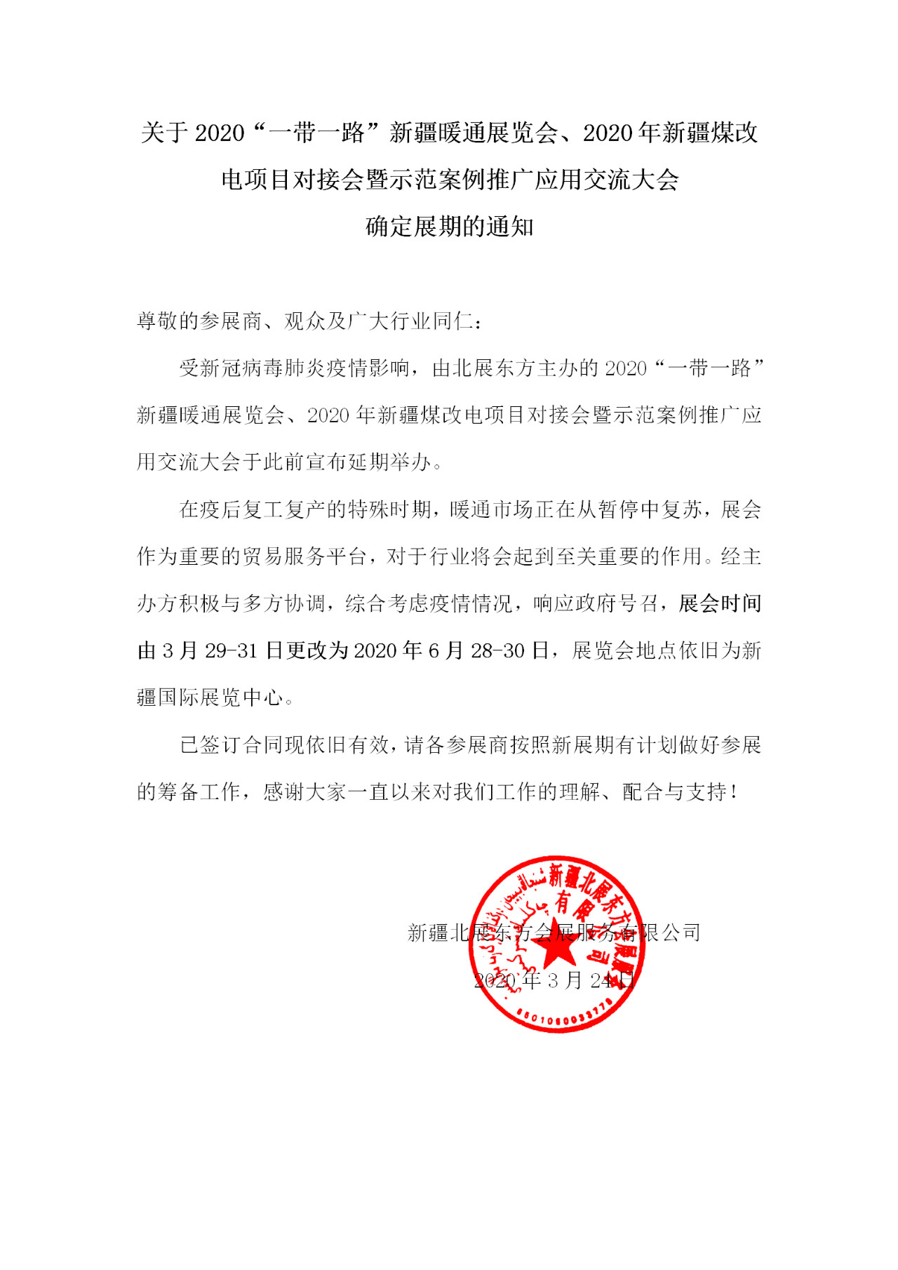 2020“一帶一路”新疆暖通展覽會、2020年新疆煤改電項目對接會暨示范案例推廣應用交流大會,現(xiàn)確定最新展期時間為2020年6月28日-30日,展覽會地點依舊為新疆國際會展中心。