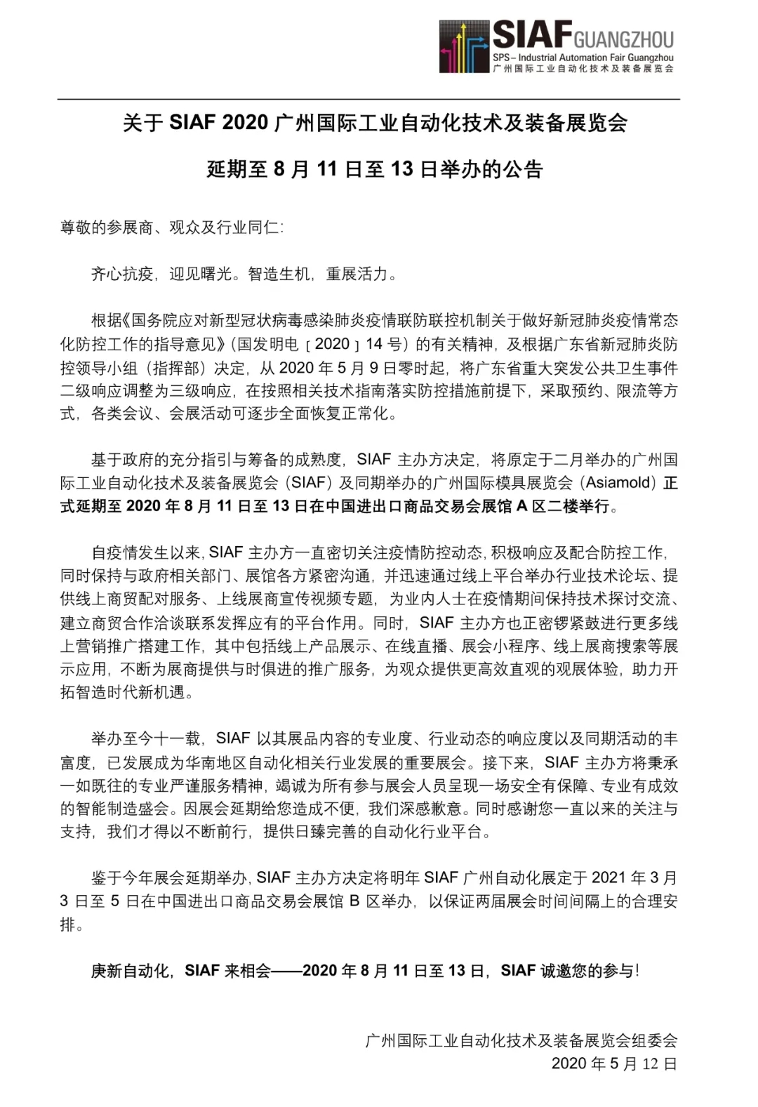 廣州光亞法蘭克福展覽有限公司董事長杜承華先生代表主辦方表示:“ 在與業(yè)內(nèi)的合作伙伴協(xié)商后,我們很高興為SIAF和Asiamold確立了新的展會日期。我們相信現(xiàn)在是一個(gè)重要時(shí)機(jī),通過SIAF和Asiamold,我們將致力為工業(yè)自動(dòng)化技術(shù)及模具領(lǐng)域提供有效的平臺,從而幫助行業(yè)復(fù)蘇。”他續(xù)說:“我們也會竭盡所能,為所有業(yè)內(nèi)人士提供一個(gè)安全的展會環(huán)境。我們稍后將會公布更多相關(guān)的防疫措施。”