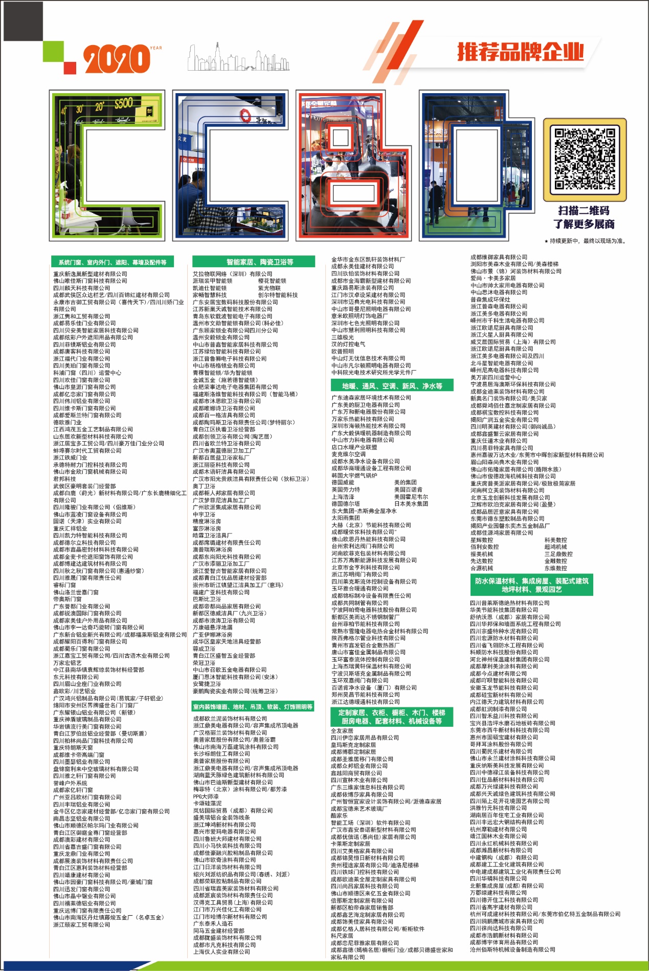 作為國內(nèi)大家居建裝行業(yè)領(lǐng)先展會,2020成都建博會秉承全產(chǎn)業(yè)鏈展出的聚合優(yōu)勢,不斷完善“大家居、智能舒適家居、節(jié)能建筑新材料“三大主題展,展館劃分細(xì)致,展品種類全面,經(jīng)過前期不斷努力,招展已經(jīng)進(jìn)入收尾工作,截止目前參展企業(yè)超1400家。展館分布為:1、2、3號門窗館,3-4連接館陶瓷展區(qū),4號智能家居/衛(wèi)浴館,5號墻面/吊頂/地材/軟裝館,5-6連接館燈飾照明展區(qū),9號活動論壇館,10號暖通凈水館,10-11連接館廚電展區(qū),11、14號定制家居館,14-15連接館定制設(shè)備展區(qū),15號建筑新材料館,16號裝配式建筑/園林館,展會由“建”到“裝”由配套材料到成品涵蓋全產(chǎn)業(yè)鏈產(chǎn)品展示,為大家居建裝行業(yè)品牌廠商、貿(mào)易單位、采購單位搭建提供更全面高效的交流商貿(mào)平臺。