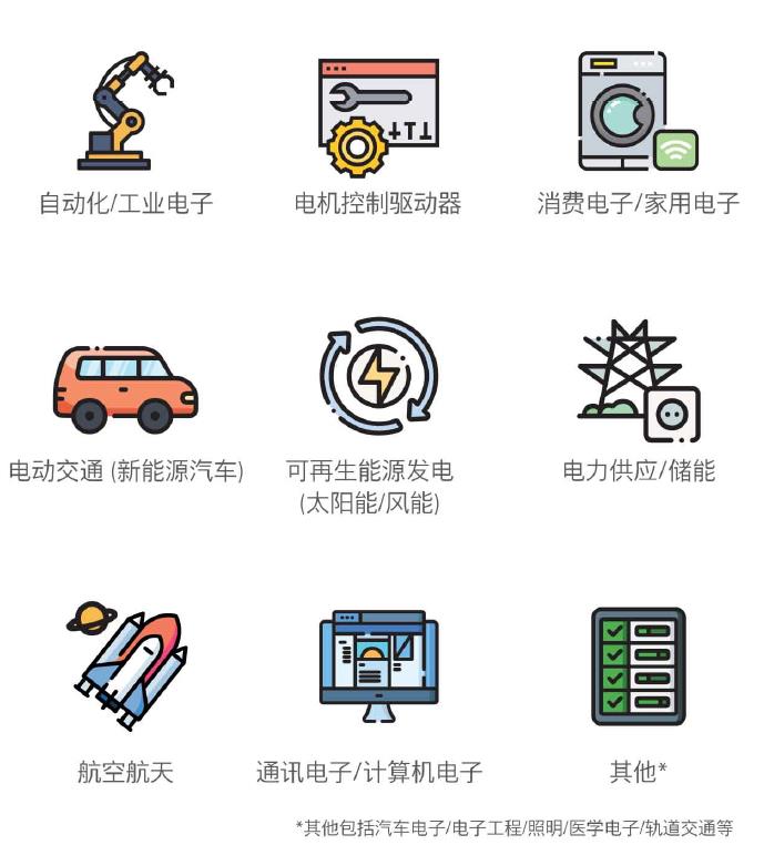 功率半導體元件及模塊、集成電路、無源元件、電磁及磁性材料、散熱管理、傳感器、裝配和子系統(tǒng)、電氣傳動、功率轉換器、電能質量&儲能、測試&測量、軟件開發(fā)、信息及服務