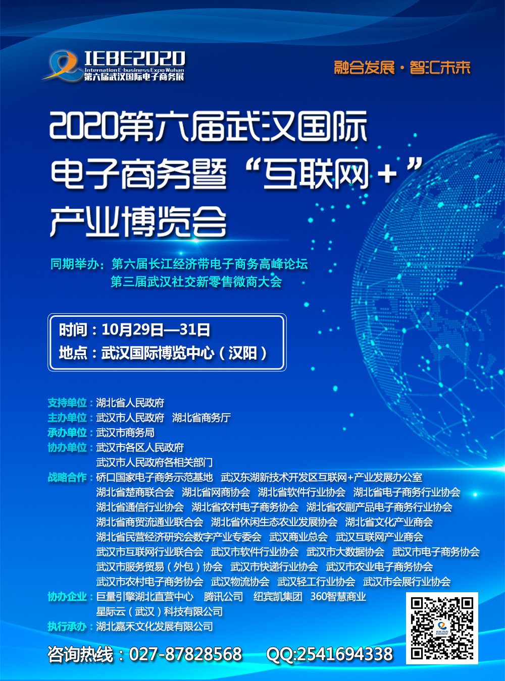 10月29日—31日,由湖北省人民政府支持,武漢市人民政府、湖北省商務(wù)廳聯(lián)合主辦,武漢市商務(wù)局承辦的2020第六屆武漢國際電子商務(wù)暨“互聯(lián)網(wǎng)+”產(chǎn)業(yè)博覽會(以下簡稱武漢電博會)將在武漢國際博覽中心隆重舉行。