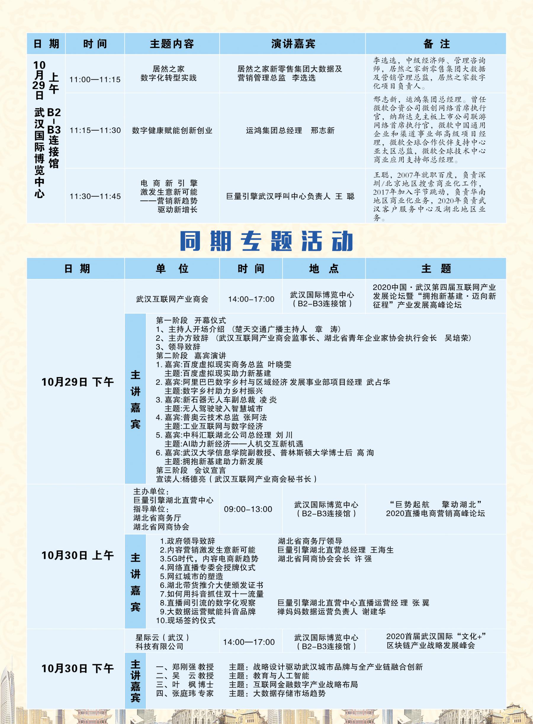 展會將于10月29日開幕,期間將同步舉辦第六屆長江經(jīng)濟帶電子商務(wù)高峰論壇、第三屆武漢社交新零售微商大會、“巨勢起航 擎動湖北”2020直播電商營銷高峰論壇、2020首屆武漢國際“文化+”區(qū)塊鏈產(chǎn)業(yè)戰(zhàn)略發(fā)展峰會、2020中國•武漢第四屆互聯(lián)網(wǎng)產(chǎn)業(yè)發(fā)展論壇暨“擁抱新基建 • 邁向新征程”產(chǎn)業(yè)發(fā)展高峰論壇、后疫情時代三農(nóng)電商發(fā)展峰會——推進(jìn)雙循環(huán),共育新商機、中國網(wǎng)商網(wǎng)貨大會、采購對接會、重點電商產(chǎn)業(yè)園考察、專題推介會、電子商務(wù)人才交流會等。重點邀請相關(guān)政府部門領(lǐng)導(dǎo)、國內(nèi)著名學(xué)者和知名電子商務(wù)企業(yè)家共同出席大會,并邀請國內(nèi)外數(shù)百家知名媒體進(jìn)行全方位報道。