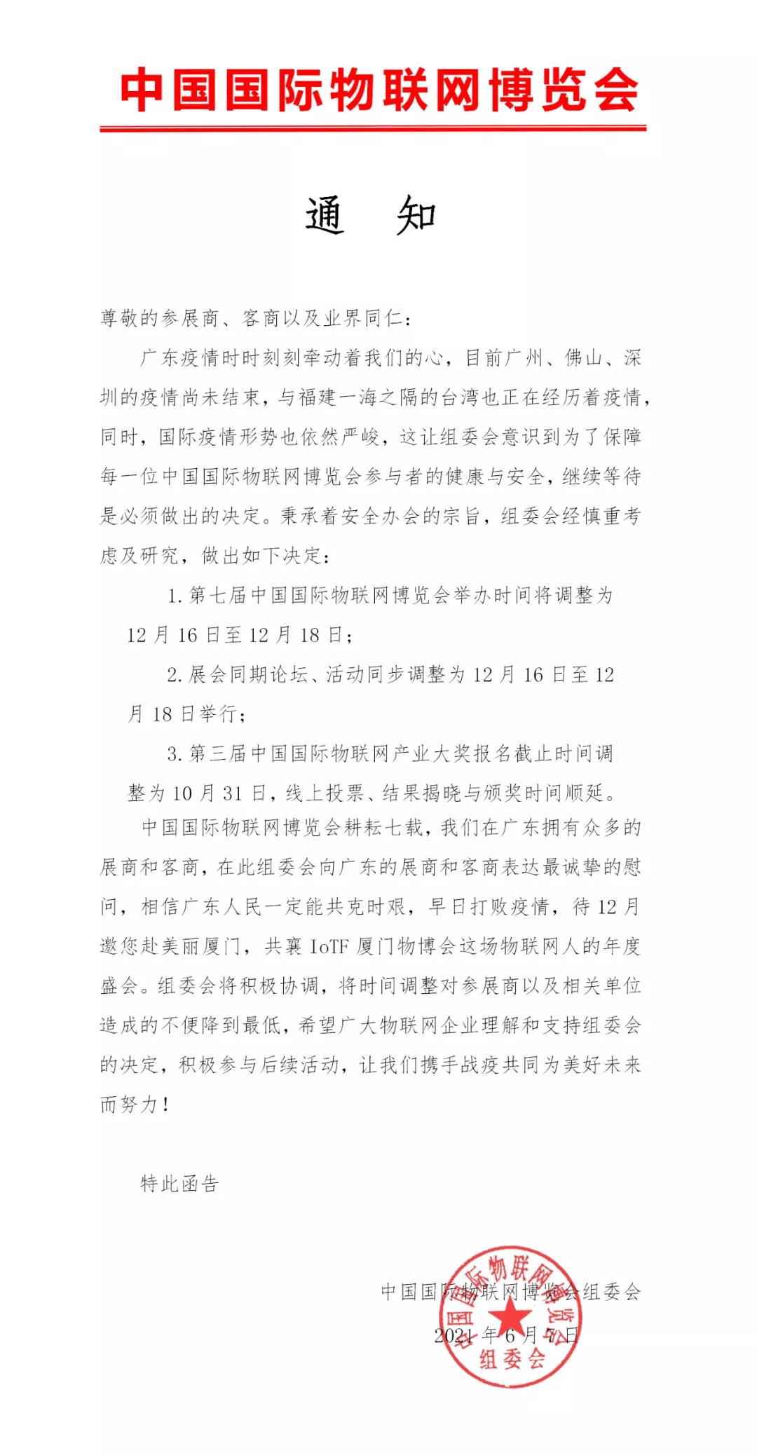 廣東的疫情時時刻刻牽動著我們的心,目前廣州、佛山、深圳的疫情尚未結(jié)束,與福建一海之隔的臺灣也正在經(jīng)歷著疫情,同時,國際疫情也依然嚴峻,這讓組委會意識到為了保障每一位中國國際物聯(lián)網(wǎng)博覽會參與者的健康與安全,繼續(xù)等待是必須做出的決定,綜合當前形勢,組委會作出以下決定: