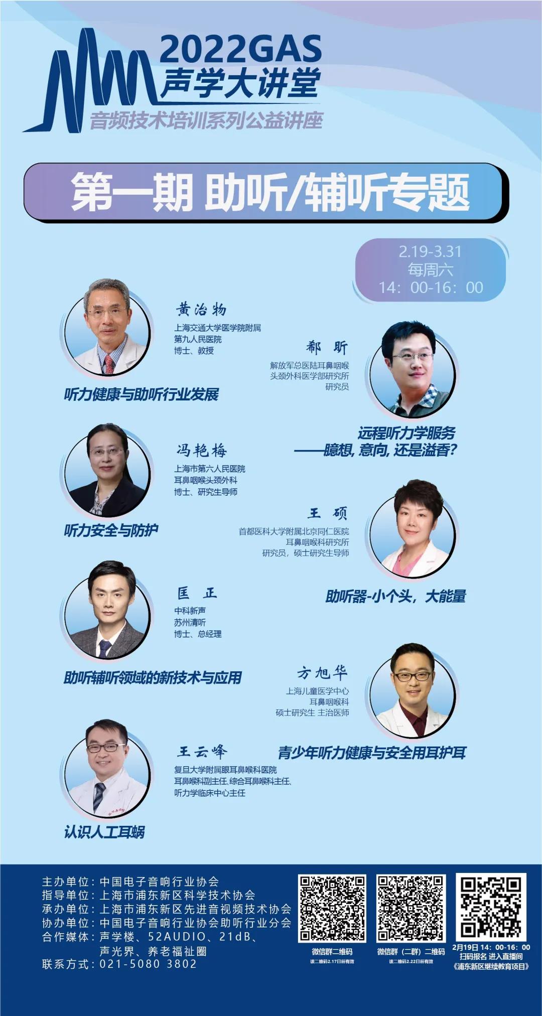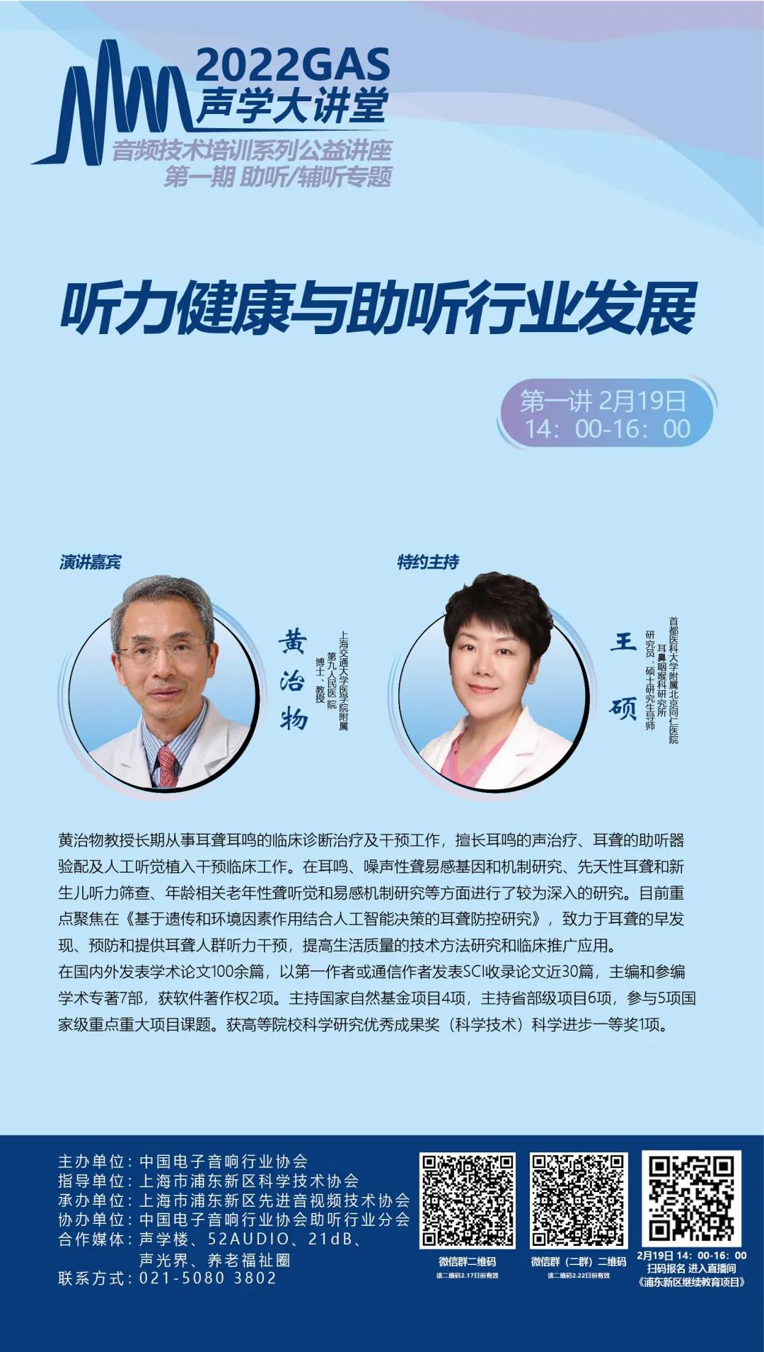 2022年2月19日下午2點(diǎn),協(xié)會將正式舉辦《2022GAS聲學(xué)大講堂—音頻技術(shù)培訓(xùn)系列公益講座》啟動大會,來自上海交通大學(xué)醫(yī)學(xué)院附屬第九人民醫(yī)院的黃治物教授為大家分享《聽力健康與助聽行業(yè)發(fā)展》。