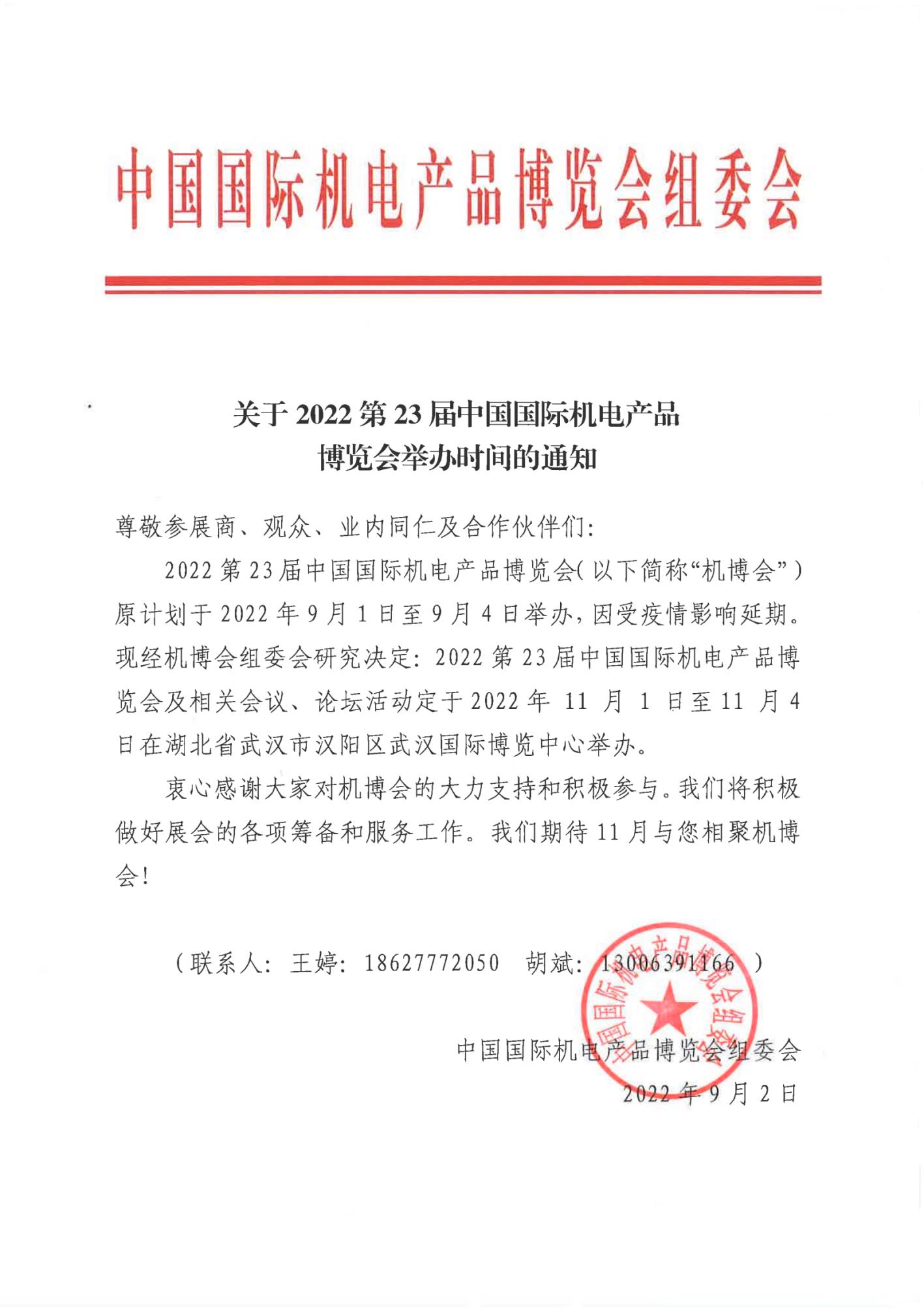 2022第23屆中國(guó)國(guó)際機(jī)電產(chǎn)品博覽會(huì)(以下簡(jiǎn)稱“機(jī)博會(huì)”)暨第11屆武漢國(guó)際機(jī)床展,原計(jì)劃于2022年9月1日至9月4日舉辦,因受疫情影響延期?,F(xiàn)經(jīng)機(jī)博會(huì)組委會(huì)研究決定:2022第23屆中國(guó)國(guó)際機(jī)電產(chǎn)品博覽會(huì)暨第11屆武漢國(guó)際機(jī)床展及相關(guān)會(huì)議、論壇活動(dòng)定于2022年11月1日至11月4日在湖北省武漢市漢陽(yáng)區(qū)武漢國(guó)際博覽中心舉辦。