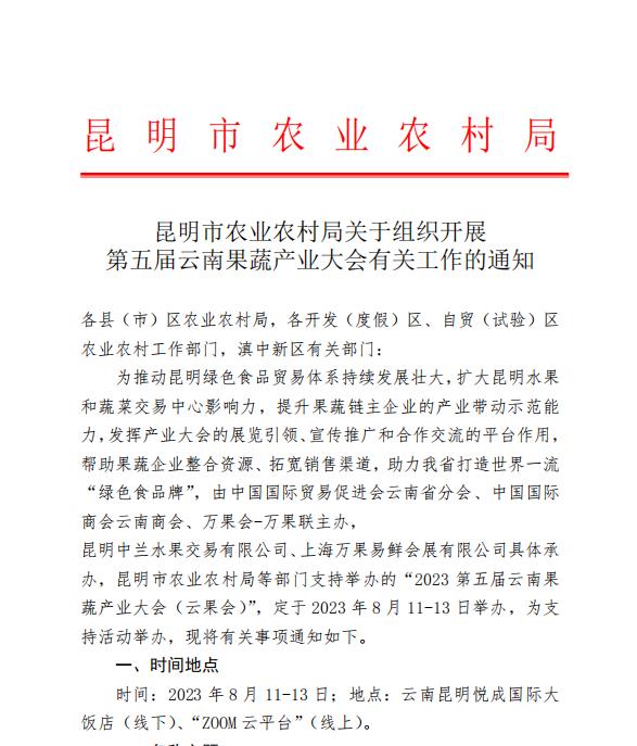 為推動(dòng)昆明綠色食品貿(mào)易體系持續(xù)發(fā)展壯大,擴(kuò)大昆明水果和蔬菜交易中心影響力,提升果蔬鏈主企業(yè)的產(chǎn)業(yè)帶動(dòng)示范能力,發(fā)揮產(chǎn)業(yè)大會(huì)的展覽引領(lǐng)、宣傳推廣和合作交流的平臺(tái)作用,幫助果蔬企業(yè)整合資源、拓寬銷售渠道,助力我省打造世界一流“綠色食品牌”,由中國(guó)國(guó)際貿(mào)易促進(jìn)會(huì)云南省分會(huì)、中國(guó)國(guó)際商會(huì)云南商會(huì)、萬(wàn)果會(huì)-萬(wàn)果聯(lián)主辦,昆明中蘭水果交易有限公司、上海萬(wàn)果易鮮會(huì)展有限公司具體承辦,昆明市農(nóng)業(yè)農(nóng)村局等部門支持舉辦的“2023 第五屆云南果蔬產(chǎn)業(yè)大會(huì) (云果會(huì))”,定于 2023 年8月 11-13 日舉辦,為支持活動(dòng)舉辦,現(xiàn)將有關(guān)事項(xiàng)通知如下。