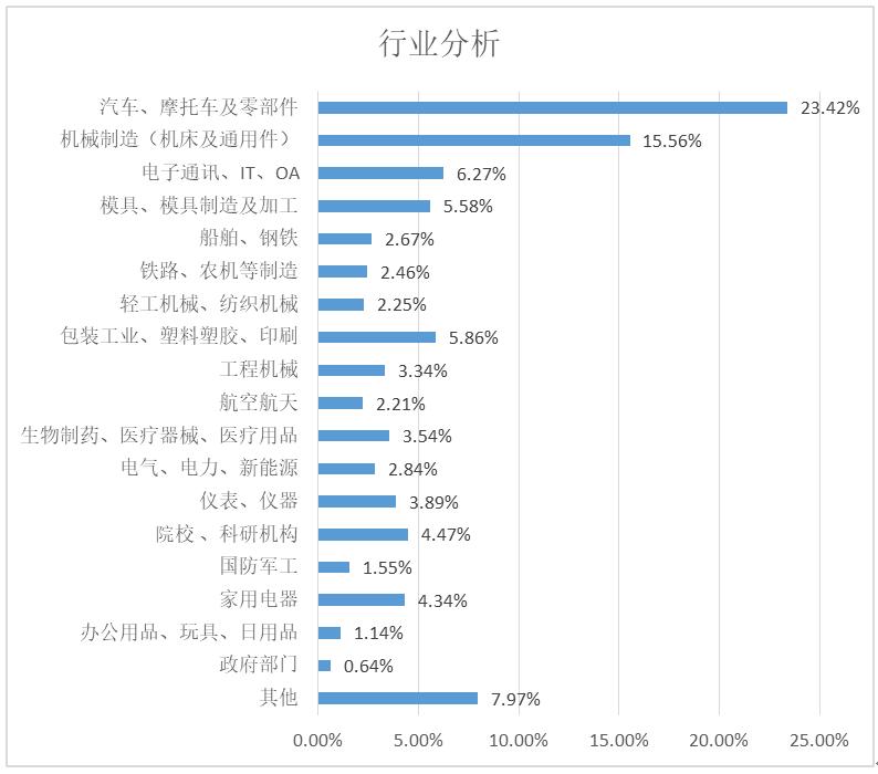 參觀展會(huì)的企業(yè)行業(yè),以汽車、摩托車及零部件企業(yè)最多,占到總數(shù)的23.42%,其次為機(jī)械制造(機(jī)床及通用件),占15.56%。此外,電子通訊、模具、船舶、鋼鐵、鐵路、農(nóng)機(jī)、輕工、橡塑包裝、工程機(jī)械、國(guó)防軍工、航空航天、生物醫(yī)藥、家電等制造行業(yè)均有涉及。