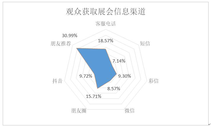 經(jīng)由微信(朋友圈、公眾號(hào)、微信群)、同行好友、打電話告知前來(lái)參觀的觀眾人數(shù)最多;其次為傳統(tǒng)紙媒、裝備嘉族;抖音、短信、微博、電視、廣播渠道也有效觸及了行業(yè)人士。
