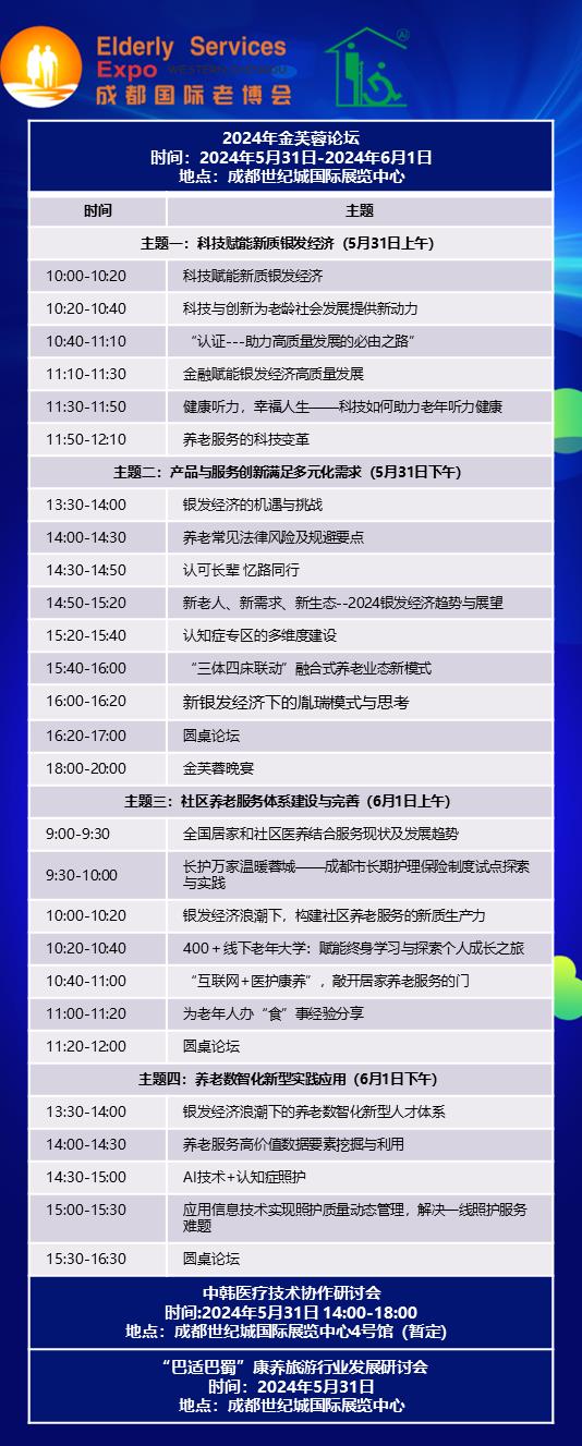 主論壇為2024金芙蓉養(yǎng)老論壇,論壇以“深耕銀發(fā)市場,力促享老騰飛”為主題。從政府、市場、社會(huì)及家庭四個(gè)層面,圍繞科技賦能、社區(qū)養(yǎng)老、養(yǎng)老數(shù)字化等社會(huì)關(guān)注的熱門話題,進(jìn)行深入討論,助力享老服務(wù)邁向更高的臺(tái)階。此外,還將召開中韓醫(yī)療技術(shù)協(xié)作研討會(huì)以及“巴適巴蜀”康養(yǎng)旅游行業(yè)發(fā)展研討會(huì),邀請展商和觀眾共同參與!
